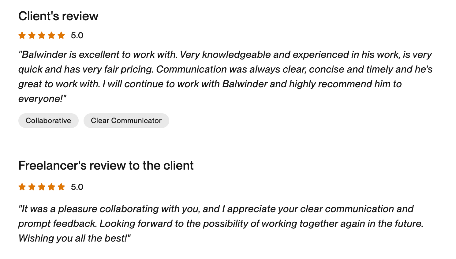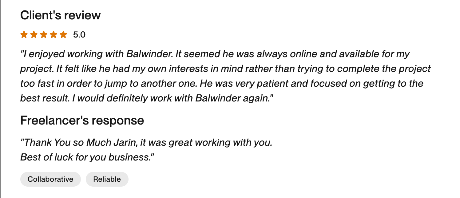 “It was a pleasure collaborating with Balwinder, and I appreciate his clear communication and prompt feedback. Looking forward to the possibility of working together again in the future. Wishing you all the best!”