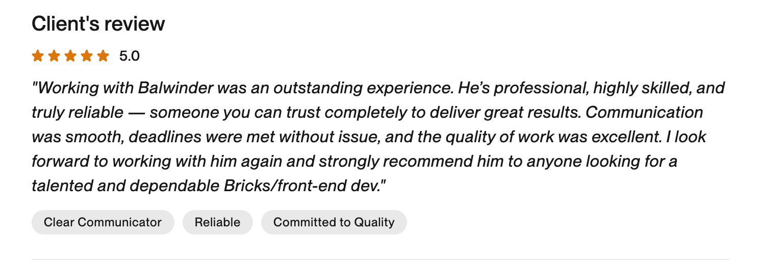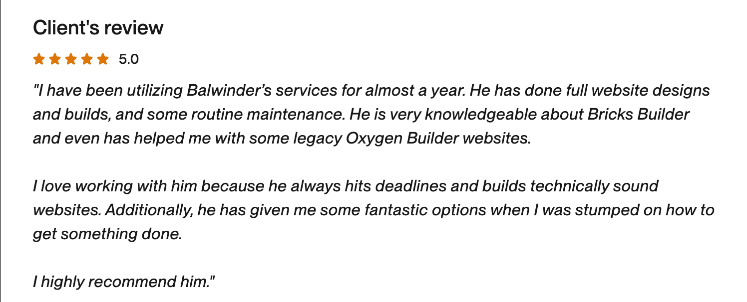 “I have been utilizing Balwinder’s services for almost a year. He has done full website designs and builds, and some routine maintenance. He is very knowledgeable about Bricks Builder and even has helped me with some legacy Oxygen Builder website.